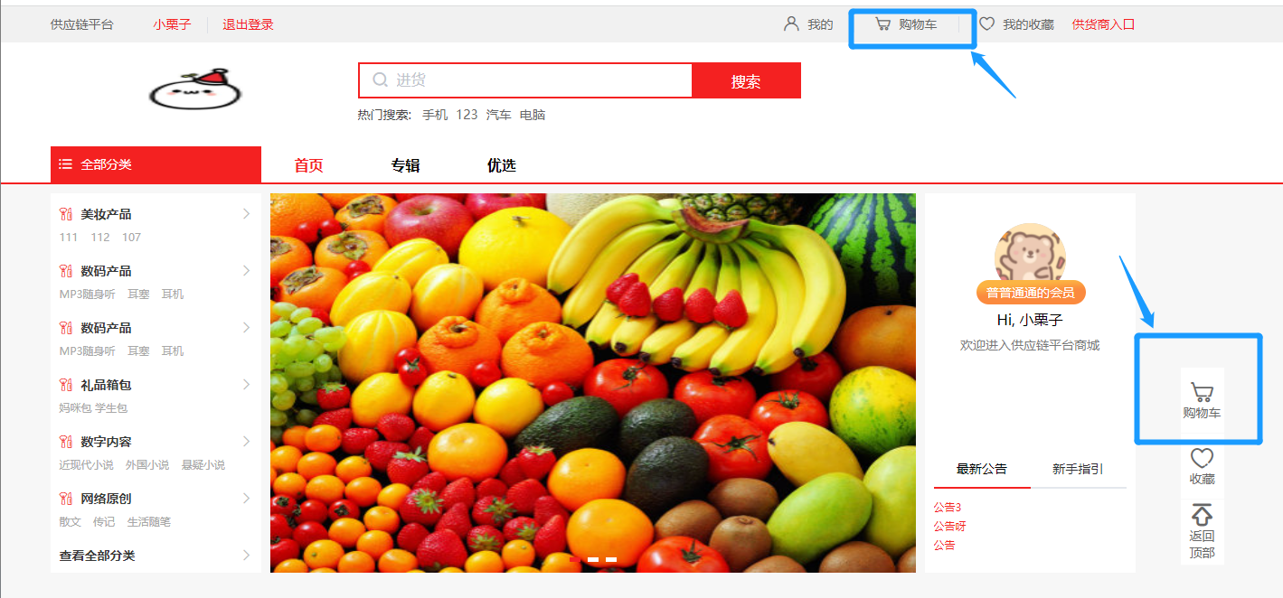 购物车可点击所有页面右边的购物车进入,也可也点击页面右上角的购物车进入
