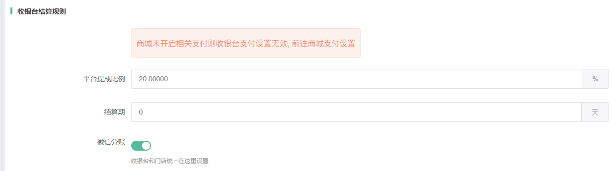 ⑹以上都操作完毕之后,到门店收银台,进行门店分账的设置,如果每个门店的平台抽佣比例不一样,可以单门店设置抽佣比例,需要分别设置线下线上的抽佣比例,开启微信聚合和微信--聚合分账(线上也是一样的操作)