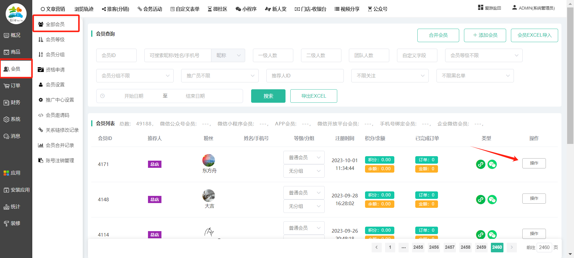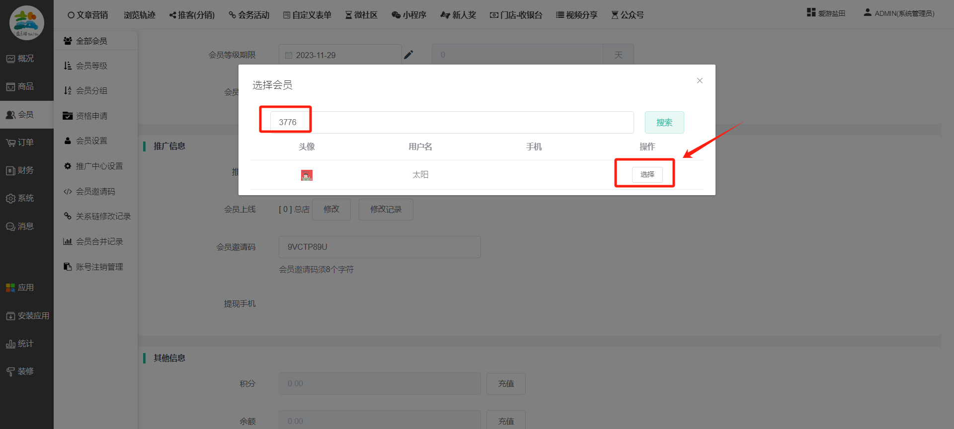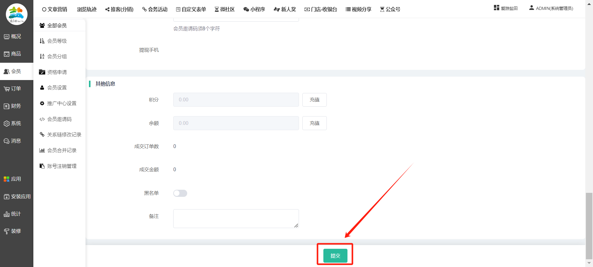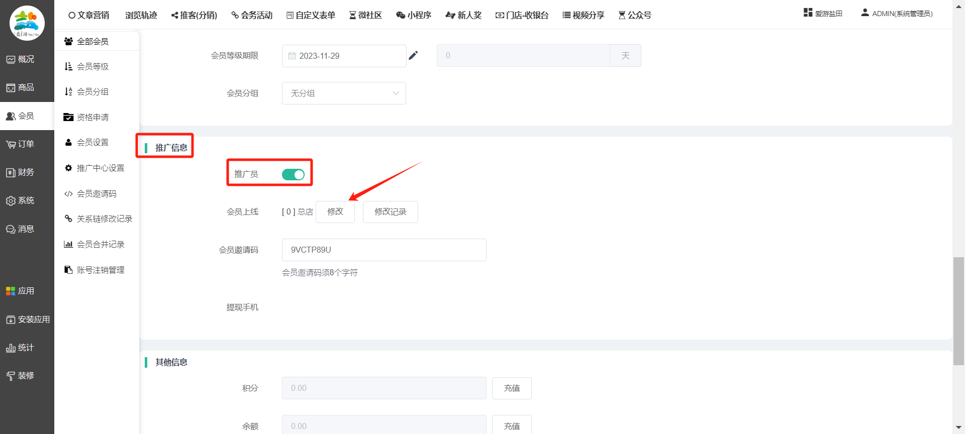 目录 搜索 展开 一、前期准备资料二、数字乡村码-上线操作指南1、服务号的申请流程及认证2、申请小程序流程3、开放平台绑定小程序和公众号三、数字乡村码-系统操作数字乡村码系统管理-概况数字乡村码-商品管理1、发布商品2、商品列表3、商品表单4、商品分类5、品牌管理6、配送模板7、评论管理8、优惠券管理9、商品标签10、退货地址设置11、满额优惠12、批量操作13、配送方式14、基础设置15、商品隐藏四、数字乡村码-会员管理1、全部会员2、会员等级3、会员分组4、资格申请5、会员设置6、推广中心设置7、会员邀请码8、会员关系链修改关系链修改记录9、会员合并记录10、账号注销管理11、会员设置中心五、数字乡村码-订单管理1、订单管理列表2、订单处理流程3、订单状态4、订单修改价格5、订单退款退货6、多包裹发货7、批量发货订单操作步骤8、催发货订单9、物流查询六、数字乡村码-财务管理1、余额设置2、会员余额3、充值记录4、转让记录5、余额明细6、收入明细7、提现设置8、提现统计9、积分管理10、转账审核11、收益广告12、批量充值七、数字乡村码-系统管理1、商城入口2、商城设置①、商城设置②、订单设置③、物流查询④、短信⑤、联系方式⑥、分类⑦、优惠券⑧、分享⑨、幻灯片⑩、广告位⑫、地图设置3、交易设置4、微信模板消息自定义消息模板(新版)自定义消息模板(旧版)小程序消息模板公众号模板消息变更公告5、语言设置6、权限管理7、多媒体管理八、数字乡村码-消息管理九、数字乡村码-应用管理十、数字乡村码系统-数据统计十一、数字乡村码-页面装修DIY1、模板管理2、店铺页面3、顶部导航4、底部导航5、DIY模板市场6、首屏广告7、基础设置8、装修DIY尺寸建议十二、供应商功能插件操作指南1、供应商2、门店-收银台门店申请和使用步骤门店管理①、门店-收银台 营销设置②、门店-收银台 分润设置门店分类门店申请门店审核门店商品门店商品订单收银台订单数据统计核销员基础设置默认设置门店装修3、微社区4、会务活动十三、营销插件操作指南活动报名提货卡新人奖微店问卷调查积分视频分享1、视频分享基础设置2、视频分享发现管理3、视频分享分类管理4、视频分享评论管理5、视频分享分红记录6、视频分享短视频中心每日红包幸运大抽奖签到优惠券二维码任务奖励优惠劵文章音频文章付费文章限时购新海报拓客卡操作流程积分活动素材中心视频红包十四、入驻门店应用类1、门店预约2、附近商品3、门店定位设置4、门店控制5、门店满额包邮6、门店满额减7、导入商品8、门店搜索9、门店股东10、核销券11、多门店核销1、商城后台设置2、前端功能演示十五、常见问题1、后台登录密码修改流程2、会员-余额,积分,后台如何进行充值与扣除3、如何修改上下级关系4、一种万能的获取商城小程序路径的方法 暂无相关搜索结果! 阅读次数:1548 本文档使用 模王系统 发布 8、会员关系链修改 8、会员关系链修改一.如何修改上下级关系?1.会员-全部会员-可以通过搜索用户的独立ID,或者用户微信昵称,找到此会员,然后点击右边的(操作)2.再点击会员详情。3.滑到下面,有个推广信息-会员上线,点击修改4.输入上级的ID号,点击搜索,出来此上级会员后点击选择。5.滑到最下面,一定要点击提交按钮。文档更新时间: 2023-11-30 14:56 作者:链上旅行