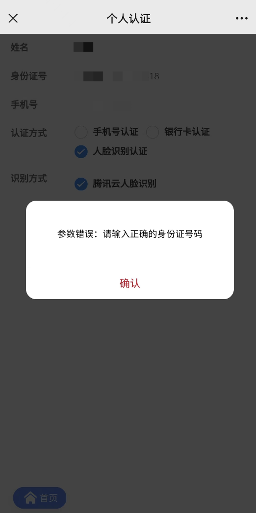 会验证身份证号的真实性,比如身份证号填写有误,会弹出提示“参数错误:请输入正确的身份证号码”,如下图
