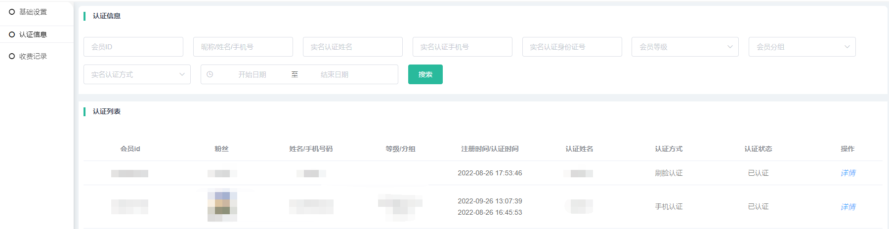 认证列表显示会员ID、粉丝、姓名/手机号码、等级/分组、注册时间/认证时间、认证姓名、认证方式、认证状态、操作可点击查看详情查看认证信息,如需查看身份证号需要认证手机号