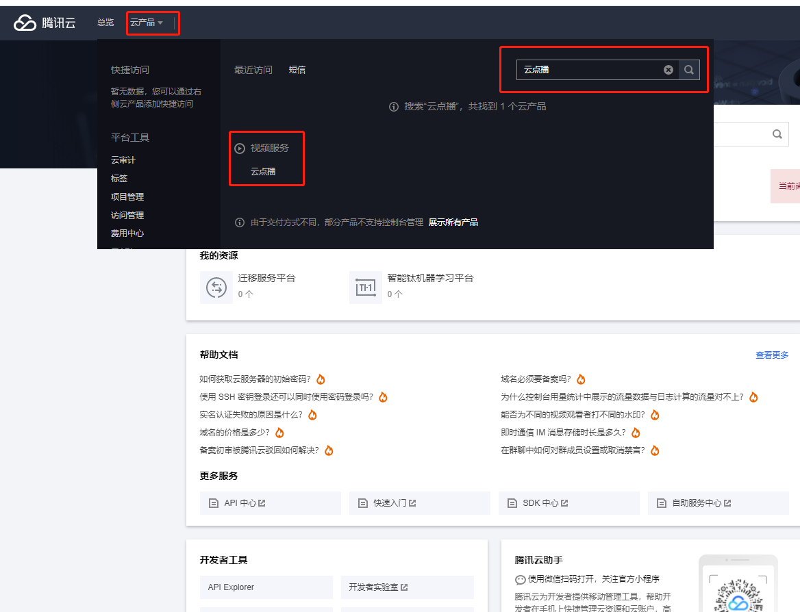 1.视频点播的逻辑是,先在模王后台的应用里面把视频点播这个应用的基础设置给设置好,然后要有一个腾讯云账号,如果没有,需要去注册一个。有了腾讯云账号之后,登录腾讯云,搜索云产品,也就是云点播。