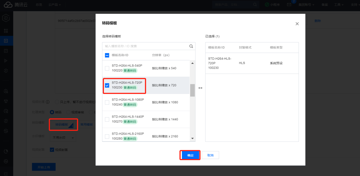 3.2.1在弹出的界面上选择转码模板注意只能选择“MP4开头”的转码方式,一般选择“MP4-720P 或 MP4-1080P” 就可以了,清晰度越高在播放时使用的流量越多,云点播平台的流量费用也会相应的增加